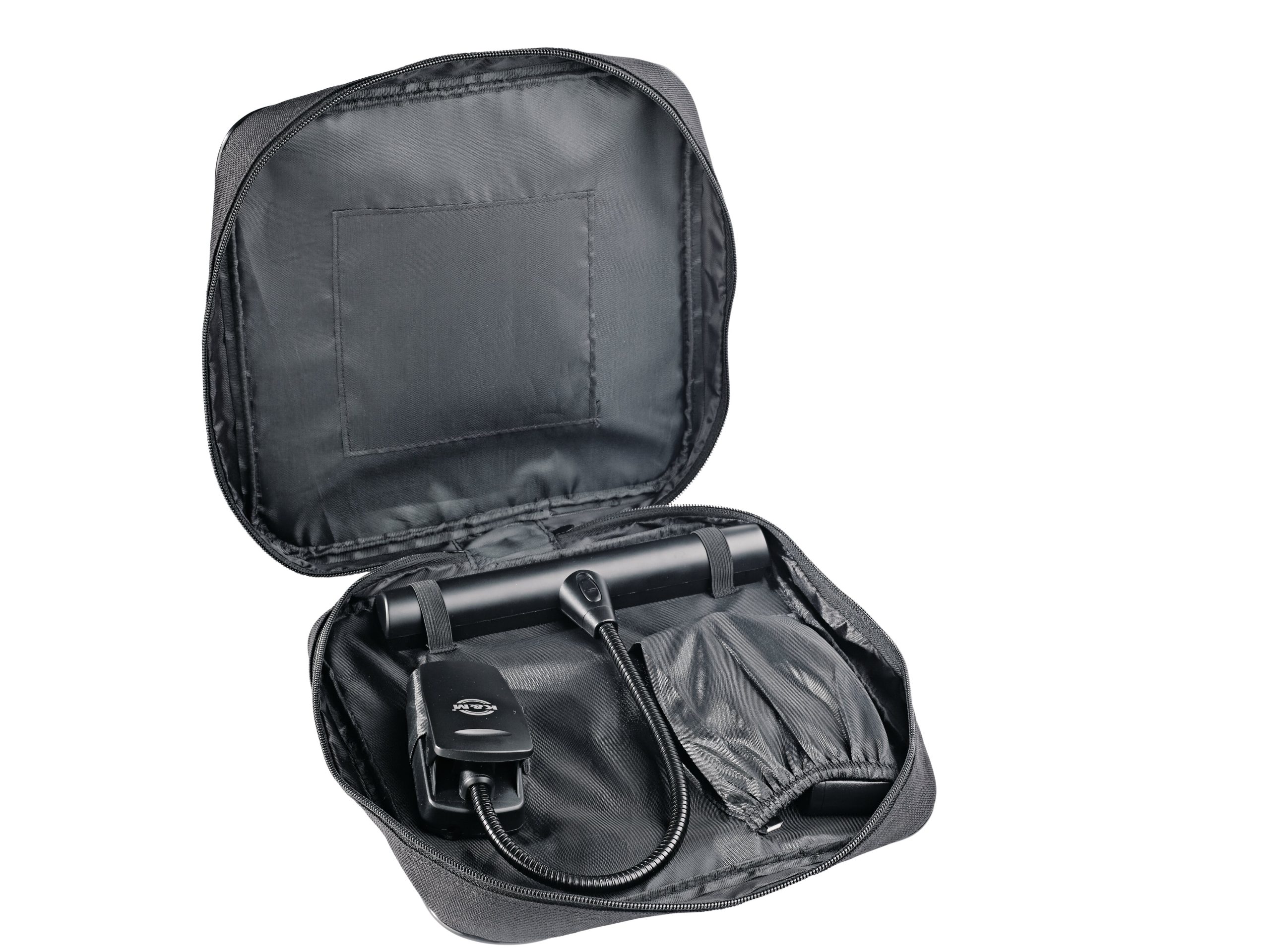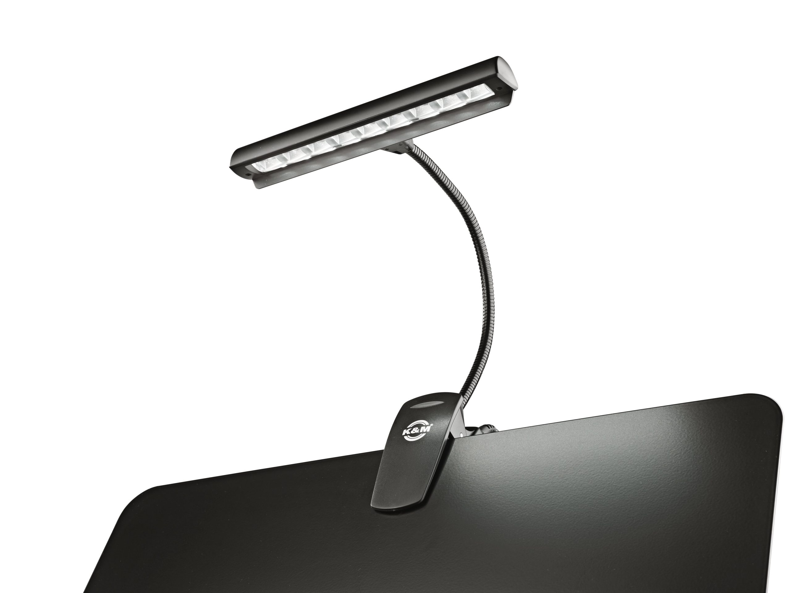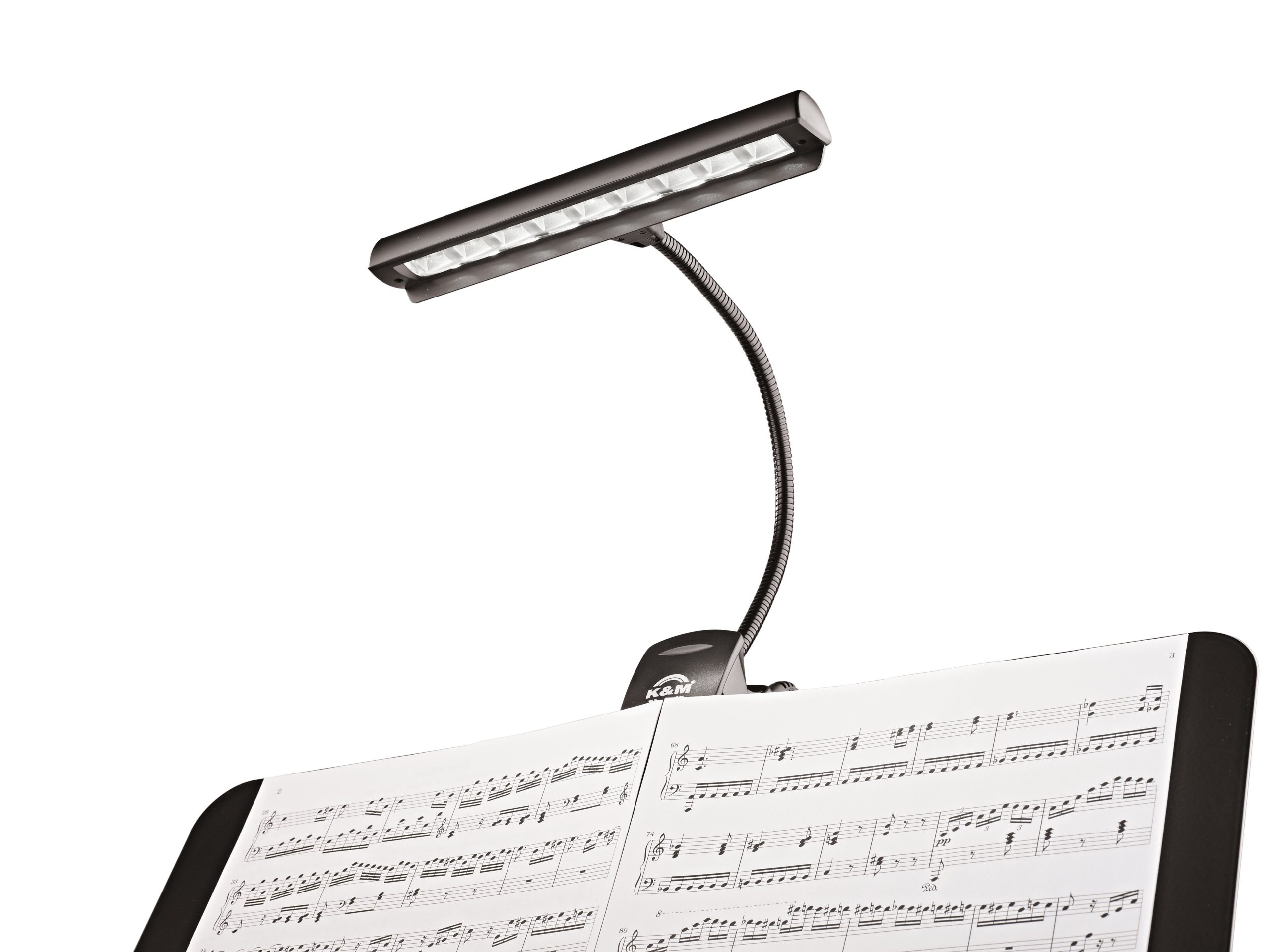 Professional orchestra light with batteries and power supply. Nine extra bright and energy-efficient LEDs provide consistent and vibrant lighting. The flexible gooseneck is fully adjustable. The light has a switch with two brightness levels. The light cone is limited to the music sheet through an anti-glare shield. An extra-strong clip provides a secure grip on music stands. The complete set is comprised of 3 AA 1.5V batteries, a power supply with a 3 m cord, as well as a durable carrying case.