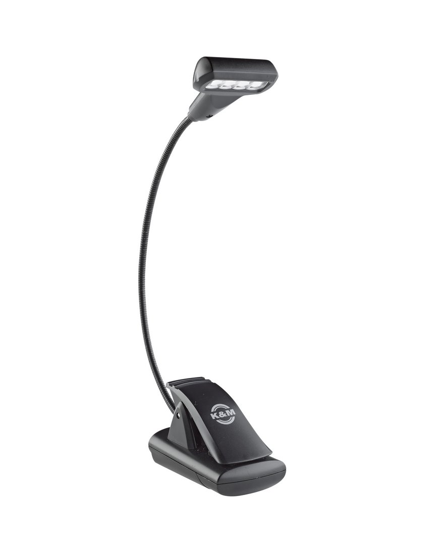 The attractive T-Model music stand light with 4 LEDs provides a pleasant warm white light with a color temperature of 3000 Kelvin. With 2 brightness settings and the adjustable gooseneck the T-Model provides comfort and versatility to accommodate all sorts of lighting needs. The extra-wide clip (up to 25 mm) attaches to music desks, table tops etc. It can also be used as a standing light. The T-Model is powered by 3 (1.5 V AAA) batteries (included) with a typical battery life of 10 hours or an AC adapter (not included)