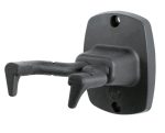 Screw-on type wall mount which accommodates a wide variety of guitar shapes. Features a patented flexible hooking-in and clamping system which quickly and firmly grasps the guitar neck. Studs at support arms provide extra protection. Support arms are covered with non-marring rubber to protect the instrument. Mounting plate made from high quality plastic material.