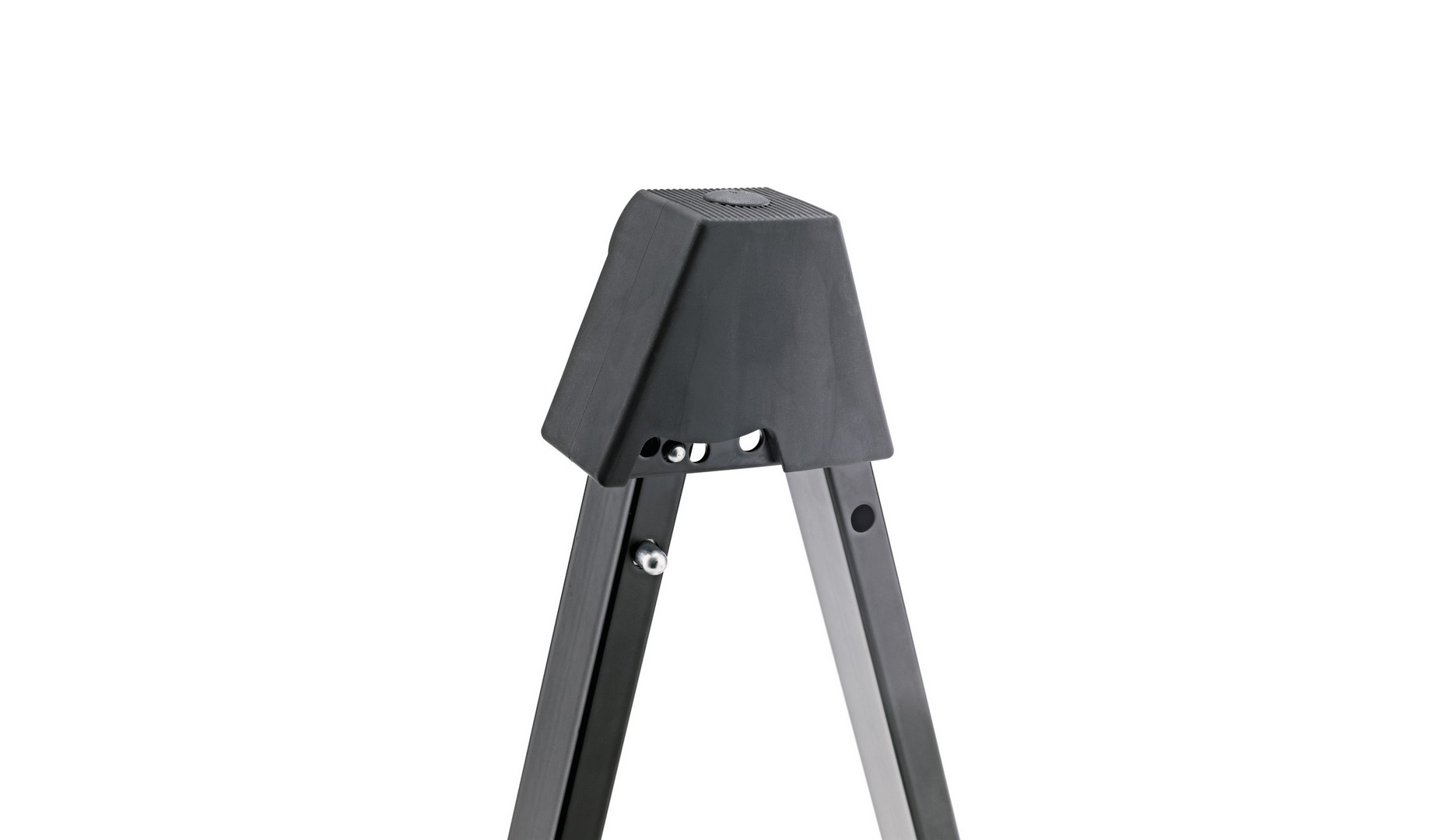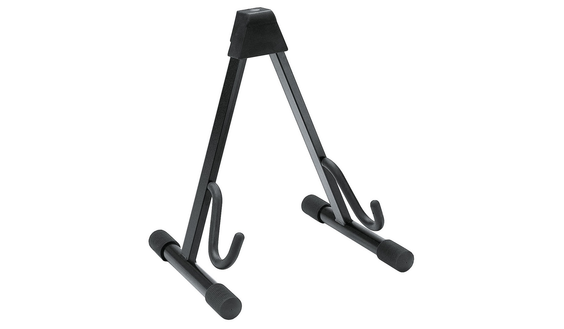 For electric guitars. Stable, sturdy, simple and easy to adjust and fold. Width adjusts from 220 to 350 mm. Support arms are covered with exclusive non-marring material to protect instrument finishes.