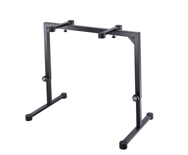 Its compact steel tubing construction and large round levelling end caps make this attractive keyboard stand significantly more stable. Two-sided spring-loaded locking screws make precision height adjustment easy. The support arms can be adjusted to suit the size of the keyboard. When folded, the table is impressively flat. The design of this table matches the piano benches 14080, 14081, 14085, 14086 and 14087. An optional extra are the stackers 18811 for a second level and 18822 for a third level, allowing the use of a second or third keyboard/laptop. Use the adapter 18814 to mount the universal holder 18817 easily and quickly.