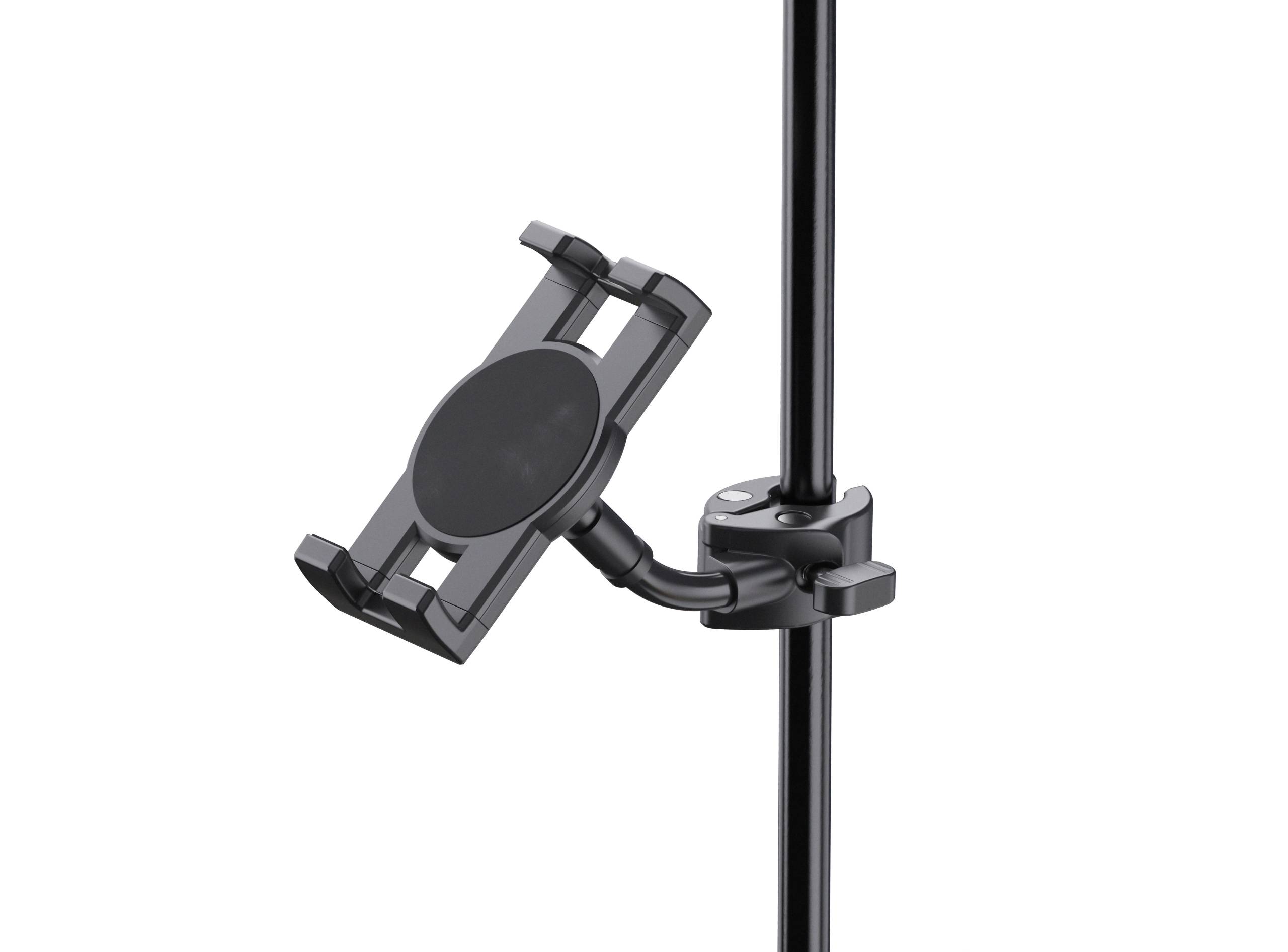 With this universal holder, your digital device is always within reach. The holder is equally suitable for smartphones and tablets. The clamping width ranges from 120 to 245 mm and with a depth of 15 mm, the electronic devices can also be used with a thick cover or case. Operation is quick and easy. Simply pull the rubber-protected clamping jaws apart and tighten with spring force. Thanks to the ball joint, the holder can be tilted up and down and rotated through 360°. The flexible mounting arm provides additional individual positioning. A sturdy clamping element with user-friendly wing nut enables quick installation on any tube from 10 to 30 mm in diameter.