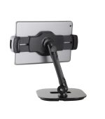 This table stand for smartphones and tablets is both stylish and functional. Holder accommodates devices from 10.2 to 13” in size, corresponding to a clamping range from 130 to 224 mm. The brackets and mounting surface are coated with non-slip rubber for added stability and peace of mind and a gentle grip. Ball-shaped head allows infinitely variable, individual positioning. The extension arm rotates 360° and is infinitely adjustable at angles from 0 to 150°. Sturdy foot design features a metal plate and base with 4 non-slip feet. The base also holds an Allen wrench (hex key) and has a convenient cable opening