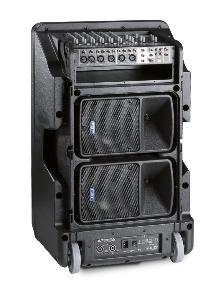 AMICO 10 USBProcessed Active Sound System: 15″ + 2x(6,5″+1″) – 500Wrms + 2x150WrmsAMICO 10 USB is a completely integrated, ready-wired sound system. The mixer amplification is a 15″ subwoofer and three PWM processed amplifiers are contained in a single ultra lightweight, yet sturdy polypropylene enclosure. It offers a professional mixing input channels with built-in class D power amplifiers and switch mode power supply. The system is powered by AC mains.PRODUCT DESCRIPTIONProcessed Active Sound System500W + 2x150W – 130dB SPL·Analog audio processor with 24dB electronic crossover network and ADAP (Advanced Dynamic Active Protection) for total protection of the components·Removable back panel for access to the satellite speakers’ storage compartment. This protects the satellite speakers and keeps them secure when transporting the complete system·Multi-function knobs to block, unblock, and remove the cover/ lid transport handle·A quick and easy set-up: complete system setup in less than 5 minutes! Just connect the satellite speakers to the AMICO 10USB amplifier outputs using the optional Speakon speaker cables and connect the AC power cable to an AC wall outlet·USB input/output to play back music programs from a computer or to record from the master audio output of the AMICO 10USB to a computer – recording program·Built-in mixing console with 6 x XLR mic inputs with phantom power supply, 2 x mono inputs and 4 x stereo input channels, 3-band EQ, 99 selectable digital effects with effects send and return controls·3 Class D power amplifiers with switch mode power supplies to power the subwoofer and the two satellite speaker