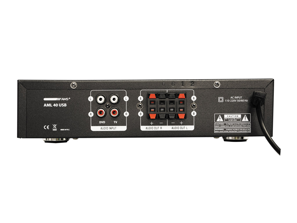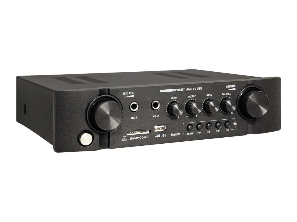 AML 40 USB is a stereo installation mixer/amplifier. It includes 4 input sources (2 LINE + 2 MIC) selectable from a frontal switch. The unit features an USB/SD interface for external audio files as well as Bluetooth connectivity. Therefore, it is possible to send audio files from a smartphone or similar device. The player interface incorporates repeat function (single track or complete folder).The variety of audio sources types make it very suitable for a big number of installations: offices (background music and messages), schools, shops or conference rooms.