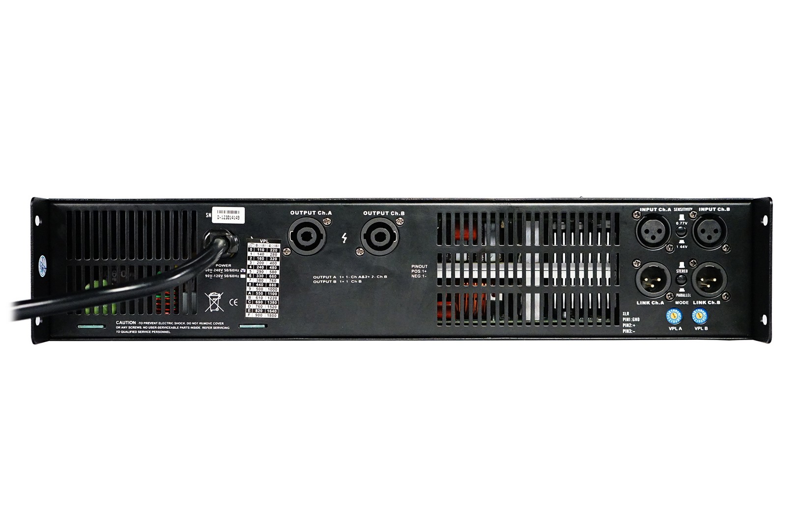 D class high performance 2 channels amplifier, 2 x900 w/8ohms , 2 x 1800w/4 ohms, XLR input, speakon output, led VU meter, temperature control fans, frequency responce 20Hz – 34Kz,adjustable VPL, 11kg.