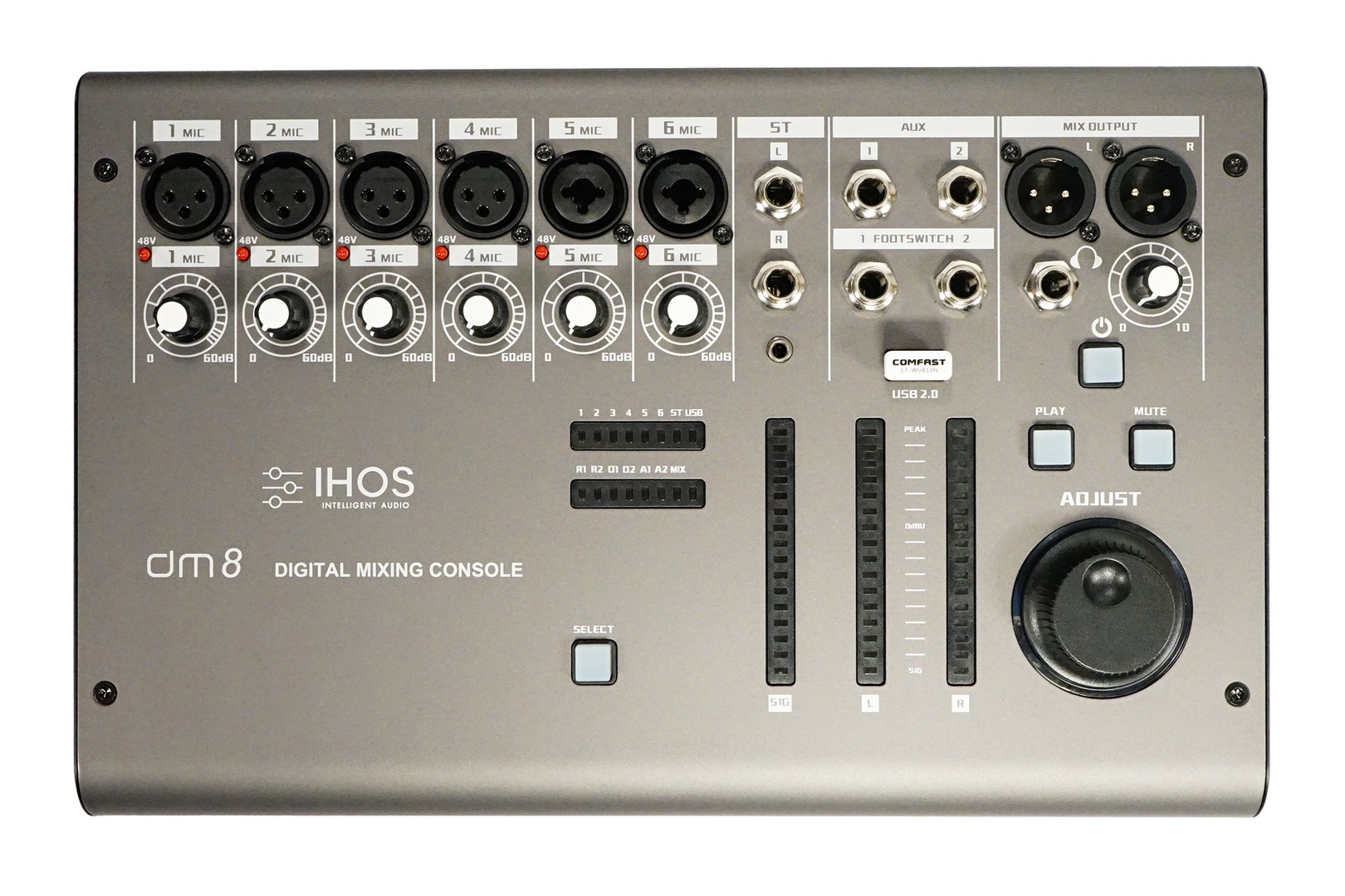 Digital mixing console , 8 channel – 6 mic inputs, 1stereo inputs, 2 XLR outputs, 2 bus, 4 Effects Modules ,2 reverb ,2 Delay, WIFI connecting to USB wireless module,1 LAN interface