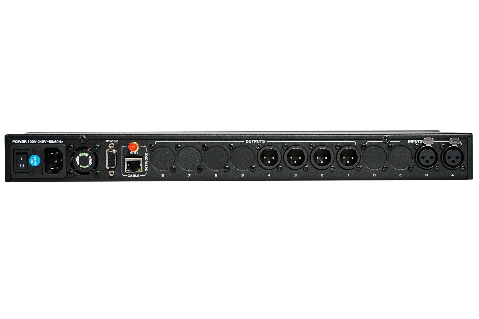 Professional audio processor 2 input/ 4output, 96KHz sampling frequency, 32bit DSP, 24bit A/D and D/A converter, 8 bands PEQ, delay up to 1000ms, HPF and LPF filters, wifi access point, PC software and tablet Professional audio processor 2 input/ 6output, 96KHz sampling frequency, 32bit DSP, 24bit A/D and D/A converter, 8 bands PEQ, delay up to 1000ms, HPF and LPF filters, wifi access point, PC software and tablet IOS and Android apllication.