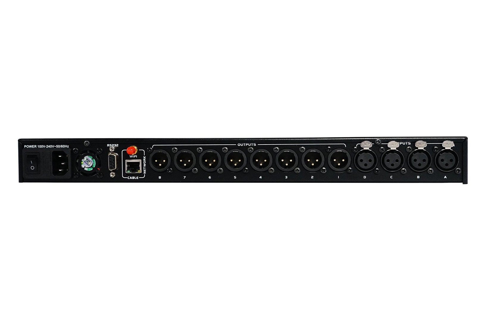 Professional audio processor 4 input/ 8output, 96KHz sampling frequency, 32bit DSP, 24bit A/D and D/A converter, 8 bands PEQ, delay up to 1000ms, HPF and LPF filters, wifi access point, PC software and tablet IOS and Android apllication.