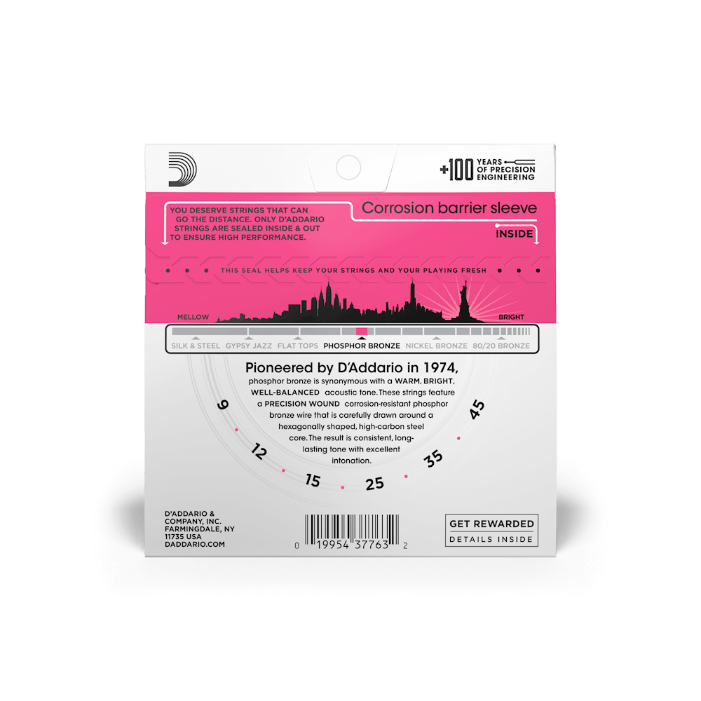 D’Addario was the first to use Phosphor Bronze in acoustic guitar strings back in 1974. Today, Phosphor Bronze is played throughout the world and considered to be the standard in acoustic strings, thanks to its beautiful sonic balance and tonal warmth. Our pioneering Phosphor Bronze acoustic guitar strings are precision wound with phosphor bronze wrap wire over a high-carbon steel core, providing tonal versatility suitable for all acoustic styles and musical genres. This 09-45 Super Light set is D’Addario’s lightest gauge for 6-string acoustic guitar, providing easy playability while retaining adequate tone and projection for most playing situations.