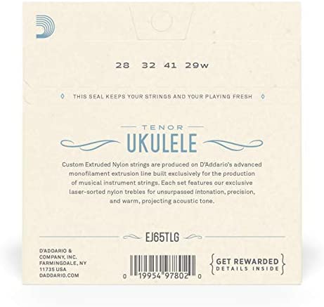 EJ65T is a string set for tenor ukulele, utilizing a silver-plated-copper wound G string and Pro-Arté Nylon trebles for the C, E, and A string for a low-G tuning. Pro-Arté Custom Extruded Nylon sets the standard in terms of ukulele tone, intonation, and dynamic response.