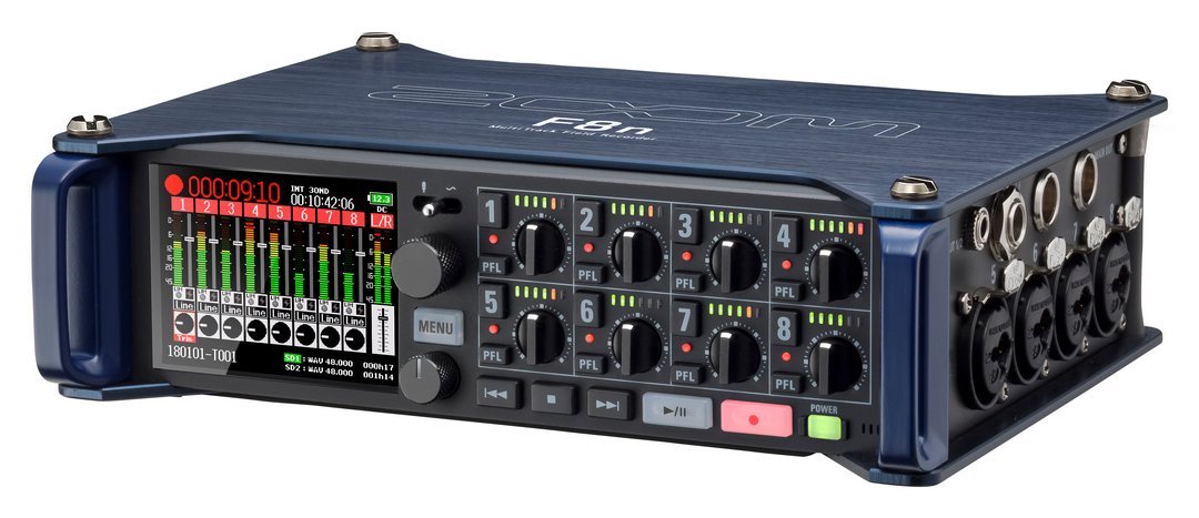 When developing the F8N, it was our mission to provide every sound professional with the tools to create something exceptional. With features such as Advanced Look-Ahead Hybrid Limiters, Zoom AutoMixâ„¢, and mic/line options for both XLR and TRS inputs, the F8n is the next generation of professional field recording. SPECSRECORDING MEDIADUAL SD CARD SLOTS SUPPORTS: 16MB–2GB SD cards, 4GB–32GB SDHC cards and 64GB–512GB SDXC cardsINPUTS 1-8CONNECTORS: XLR/TRS combo jacks (XLR: 2 hot, TRS: TIP hot)INPUT SOURCE SET TO MICINPUT GAIN: +10 – +75 dBINPUT IMPEDANCE: 2 kΩMAXIMUM INPUT LEVEL: +14 dBu (at 0 dBFS, limiter ON)PHANTOM POWER: +24/+48V 10mA maximum for each channelINPUT SOURCE SET TO LINEINPUT GAIN: -10 – +55 dBINPUT IMPEDANCE: 2.6 kΩMAXIMUM INPUT LEVEL: +24 dBu (at 0 dBFS, limiter ON)INPUTS: ADDITIONAL INFOEQUIVALENT INPUT NOISE: −127 dBu or less (A-weighted, +75dB input gain, 150Ω input)FREQUENCY CHARACTERISTICS: 10 Hz – 80 kHz +0.5dB/−1dB (192kHz sampling rate)A/D DYNAMIC RANGE: 120 dB typ (−60dBFS input, A-weighted)CROSSTALK: −90 dB or less (between adjacent channels, 1kHz)MIC IN: ZOOM mic capsule input (use disables Inputs 1/2)SLATE MIC: Built-in mic for voice memos can be assigned to tracks freelyOUTPUTS : MAIN OUT 1/2CONNECTORS: TA-3 connectors, balanced output (2: hot)OUTPUT IMPEDANCE: 150 Ω or lessREFERENCE OUTPUT LEVEL: −10 dBV (normal output level), +4 dBu (Output Level: Line), 1 kHz, 600Ω loadMAXIMUM OUTPUT LEVEL: +10 dBV (normal output level), +24 dBu (Output Level: Line), 1 kHz, 600Ω loadOUTPUTS: SUB OUT 1/2CONNECTOR: 3.5mm stereo mini unbalanced output jackOUTPUT IMPEDANCE: 100 Ω or lessREFERENCE OUTPUT LEVEL: −10 dBV (normal output level), −40 dBV (mic output level), 1 kHz, 10kΩ loadMAXIMUM OUTPUT LEVEL: +10 dBV (normal output level), -20 dBV (mic output level), 1 kHz, 10kΩ loadHEADPHONECONNECTOR: 1/4″ unbalanced stereo output jackOUTPUT IMPEDANCE: 15 Ω or lessMAXIMUM OUTPUT LEVEL: 100mW + 100mW (32Ω load)D/AD/A DYNAMIC RANGE: 106 dB typ (−60dBFS input, A-weighted)RECORDING FORMATS: WHEN WAV SELECTEDSUPPORTED FORMATS: 44.1/47.952/48/48.048/88.2/96/192kHz, 16/24-bit, mono/stereo//2-10ch poly, BWF and iXMLMAXIMUM SIMULTANEOUS RECORDING TRACKS: 10 (8 inputs + stereo mix)8 (at 192kHz sampling rate)RECORDING FORMATS: WHEN MP3 SELECTEDSUPPORTED FORMATS: 128/192/320kbps, 44.1/48kHz, ID3v1 tagsMAXIMUM SIMULTANEOUS RECORDING TRACKS: 2RECORDING TIMEUSING A 32GB CARD: 30:51:00 (48 kHz/24-bit stereo WAV)7:42:00 (192 kHz/24-bit stereo WAV)TIME CODECONNECTOR: BNCMODES: Off, Int Free Run, Int Record Run, Int RTC Run, Ext, Ext Auto Rec (audio clock can be synchronized to timecode)FRAME RATES: 23.976ND, 24ND, 25ND, 29.97ND, 29.97D, 30ND, 30DPRECISION: ±0.2 ppmSUPPORTED INPUT LEVELS: 0.2 – 5.0 VppINPUT IMPEDANCE: 4.6 kΩOUTPUT LEVEL: 3.3 VppOUTPUT IMPEDANCE: 50 Ω or lessPOWER SUPPLIESBATTERIES: 8 AAAC ADAPTER: AC adapter: AD-19 DC12V 2A (center plus)EXTERNAL DC POWER SUPPLY: HIROSE HR10A-7R-4S 4-pin connector(1 pin: −, 4 pin: +), 9–18 VPOWER CONSUMPTION: 15 WCONTINUOUS RECORDING TIME WHEN RECORDING 2 CHANNELS AT 48KHZ/16-BIT TO SD1 WITH MAIN/SUB OUT OFF, TIME CODE OFF, LED/LCD BRIGHTNESS 5, 32Ω HEAD- PHONES, PHANTOM OFFALKALINE BATTERIES: 6 hours or moreNIMH (2450MAH): 8.5 hours or moreLITHIUM BATTERIES: 12 hours or moreCONTINUOUS RECORDING TIME WHEN RECORDING 8 CHANNELS AT 48KHZ/24-BIT TO SD1 WITH MAIN/SUB OUT OFF, TIME CODE OFF, LED/LCD BRIGHTNESS 5, 32Ω HEAD- PHONES, PHANTOM OFFALKALINE BATTERIES: 3.5 hours or moreNIMH (2450MAH): 6 hours or moreLITHIUM BATTERIES: 8 hours or moreCONTINUOUS RECORDING TIME WHEN RECORDING 8 CHANNELS AT 192KHZ/24-BIT TO SD1 WITH MAIN/SUB OUT ON, TIME CODE INT FREE RUN, LED/LCD BRIGHTNESS 60, 32Ω HEADPHONES, PHANTOM 48VALKALINE BATTERIES: 1 hour or moreNIMH (2450MAH): 2 hours or moreLITHIUM BATTERIES: 3 hours or moreDISPLAY2.4″ FULL-COLOR LCD: 320x240USB: MASS STORAGE OPERATIONCLASS: USB 2.0 High SpeedUSB: MULTI TRACK AUDIO INTERFACE OPERATION (DRIVER REQUIRED FOR WINDOWS, NOT REQUIRED FOR MAC)CLASS: USB 2.0 High Speed