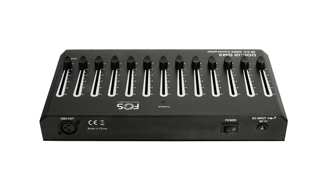 12 Channels Dmx Controller, 12 individual channel faders & one master fader. 12 DMX channels. Compact design & simple operation, DMX Output: 3 pin female XLR DMX connector.