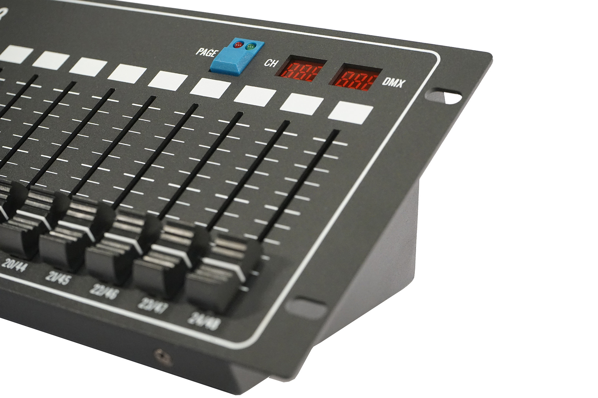 Dmx Controller 48 channel, 24 sliders + 1 page button, Dip switch for addressing output channel, LED display for channel & DMX value, XLR In/Out: 3pin, LTP support in DMX output, 2kg.