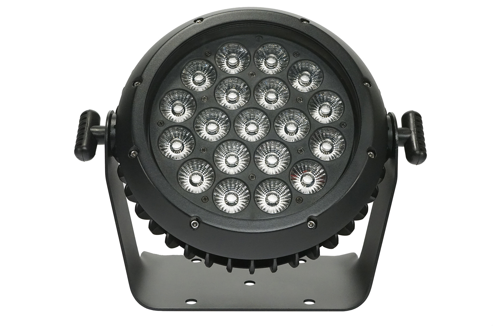 Contemporary IP65 led par with Wireless DMX operation and amazing color mixing, 19 LEDS 12 watts RGBW + Amber + UV, 26 degrees beam angle, 0-100% linear dimmer, flicker-free, 3 pixels rings, strobe effect with 1-25T /s, 22/10 DMX channel, IP rated power and DMX connector IN/OUT, Dual mounting brackets for installation/floor stand, Built, noise-free aluminum cooling system, built-in programs, and macro effects.
