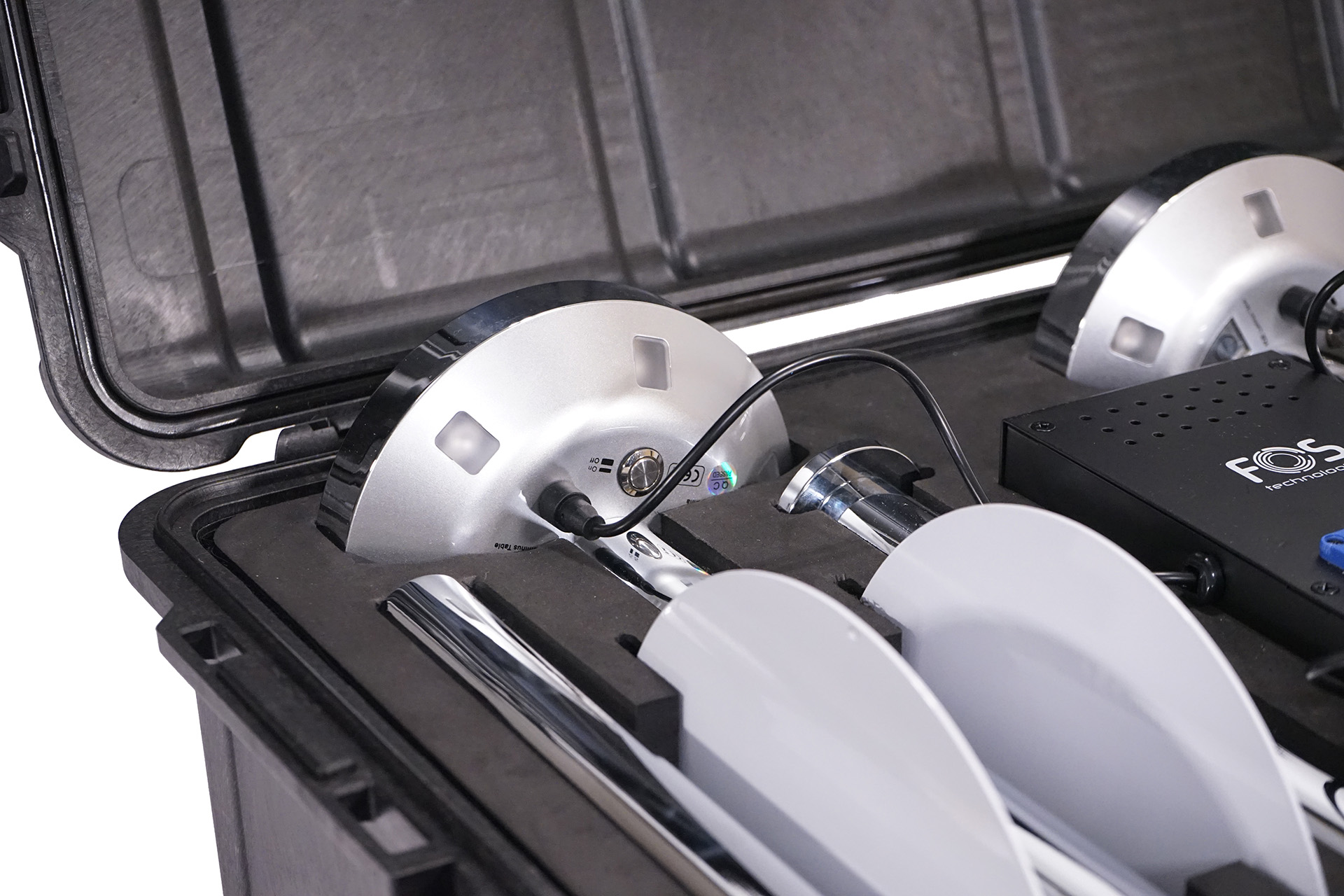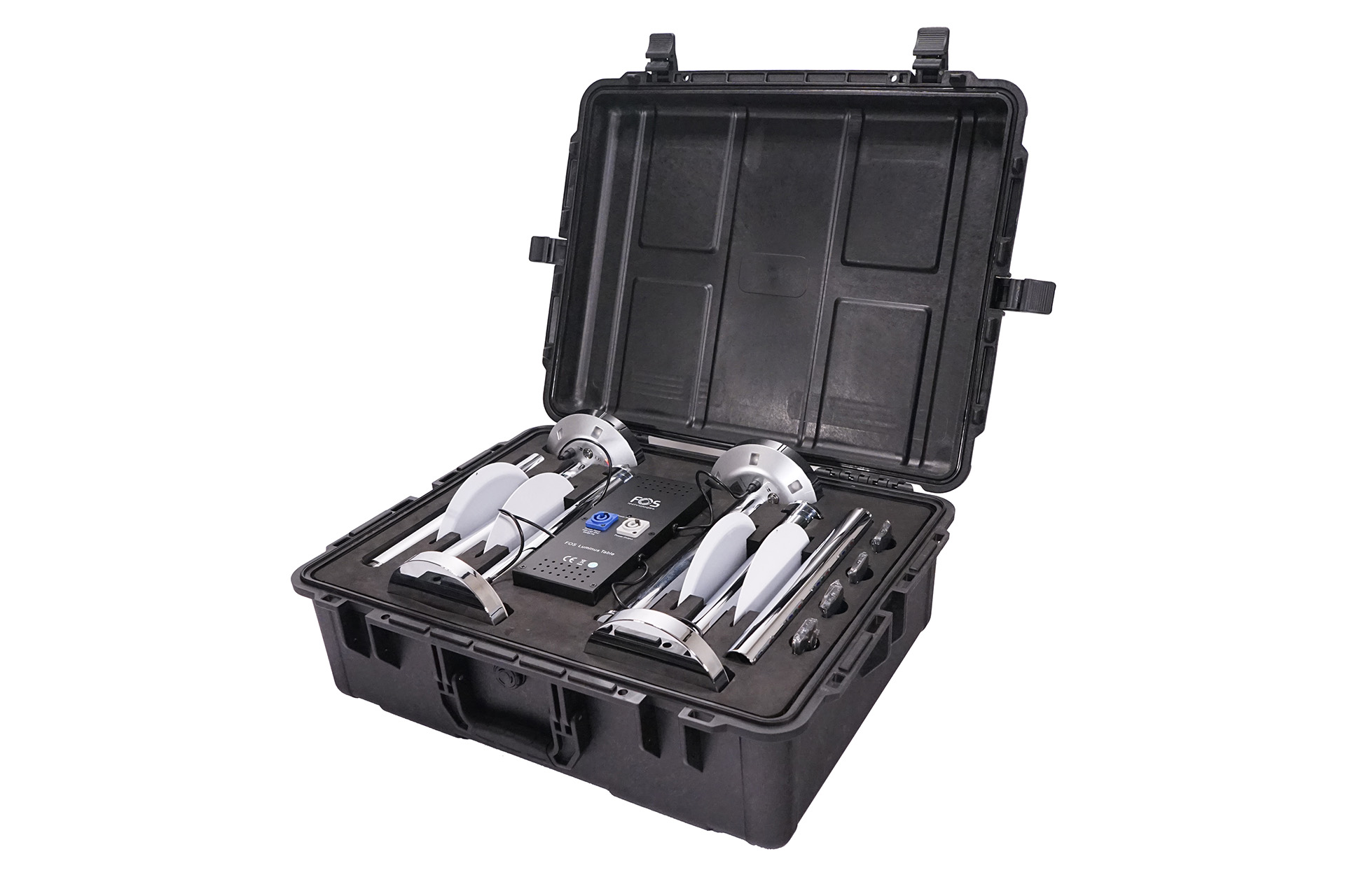 ABS case with foam and charging station for 4 pcs Luminus table battery lights, with space for all their accessories.
