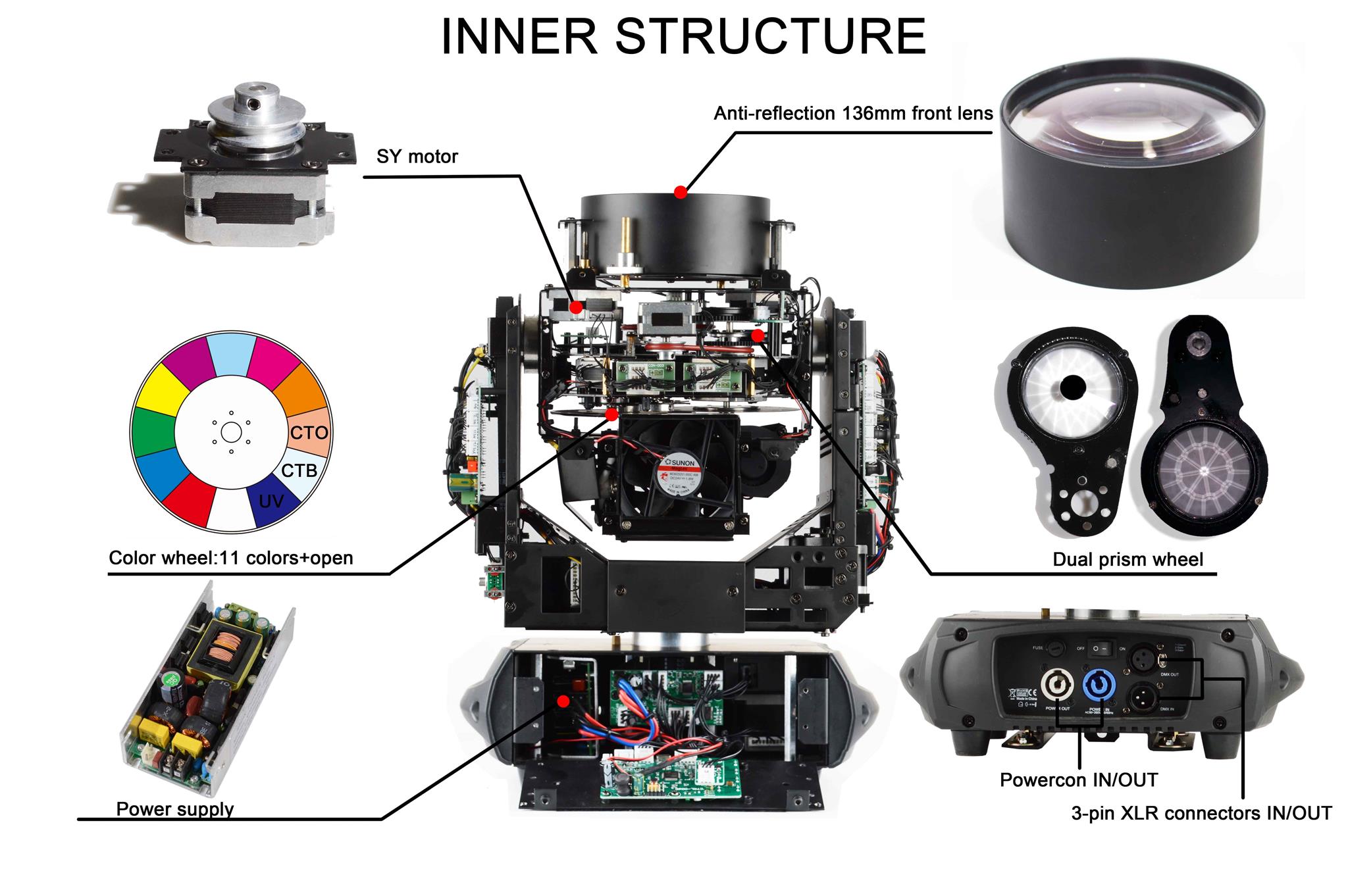 Anti-reflection 136mm front lenses , Control Channel:14/16 DMX ,11 colors , 16 gobos , Frost filter, Motorized focus from near to far (2.5M-30M) , 13.2kgs.