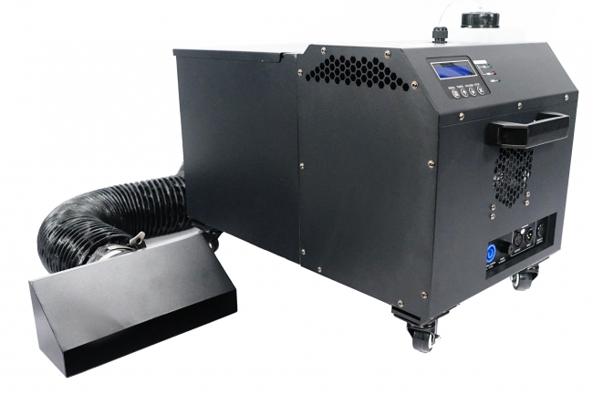 Amazing Low Fog 1200 watt smoke machine that needs only water supply for 100 sqm stage, no need Co2 or Dry ice. DMX 512 , Remote Control LCD screen, 2 dmx channels, heat up time 3.05 mins, fluid consumption 1-40ml/min, fluid-less protection, self cleaning function.