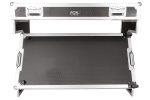 Foldable Z-style DJ table flight case with handles and wheels, rendering it highly portable, simple to set up, and easy to break down for DJs . Its durable construction from black plywood with handles and wheels.