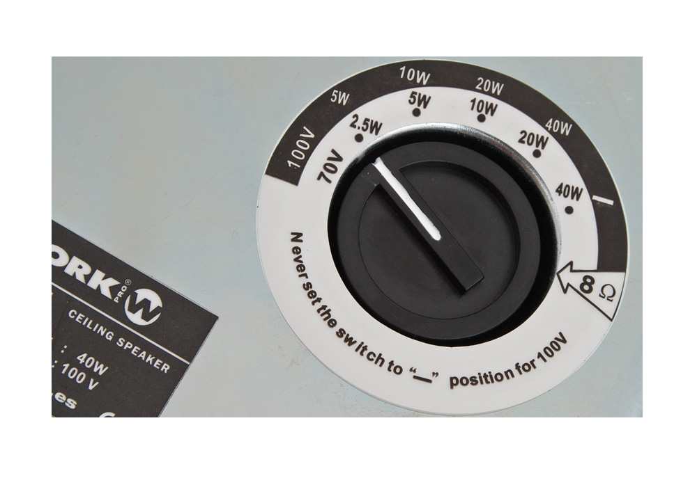 Ceiling speaker. 40 W @ 8 Ohm. 40/20/10/5 W @ L100V. 8” Woofer + 0.5” Tweeter.