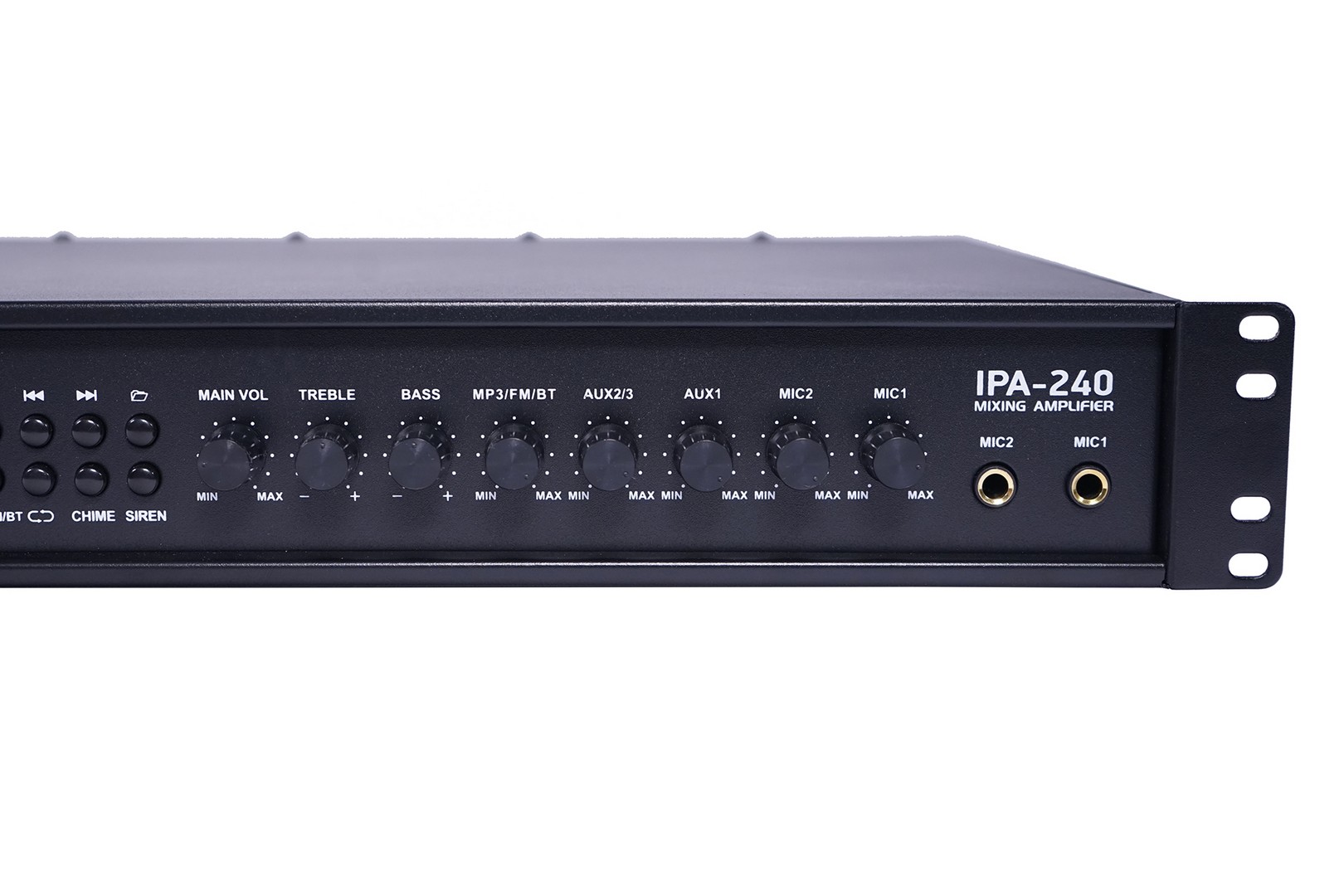 Public Address mixer amplifier 240w , 100V / 70V constant voltage output, 8 ohm constant resistance output, mp3, bluetooth, FM tuner ,USB interface,LCD screen, 3 line input, 2 mic input, 1 line output.Treble and Bass,IR control function