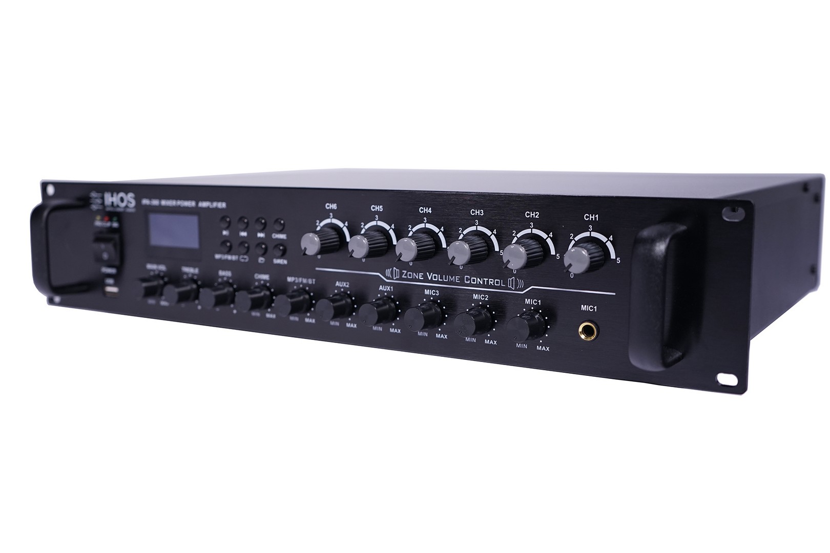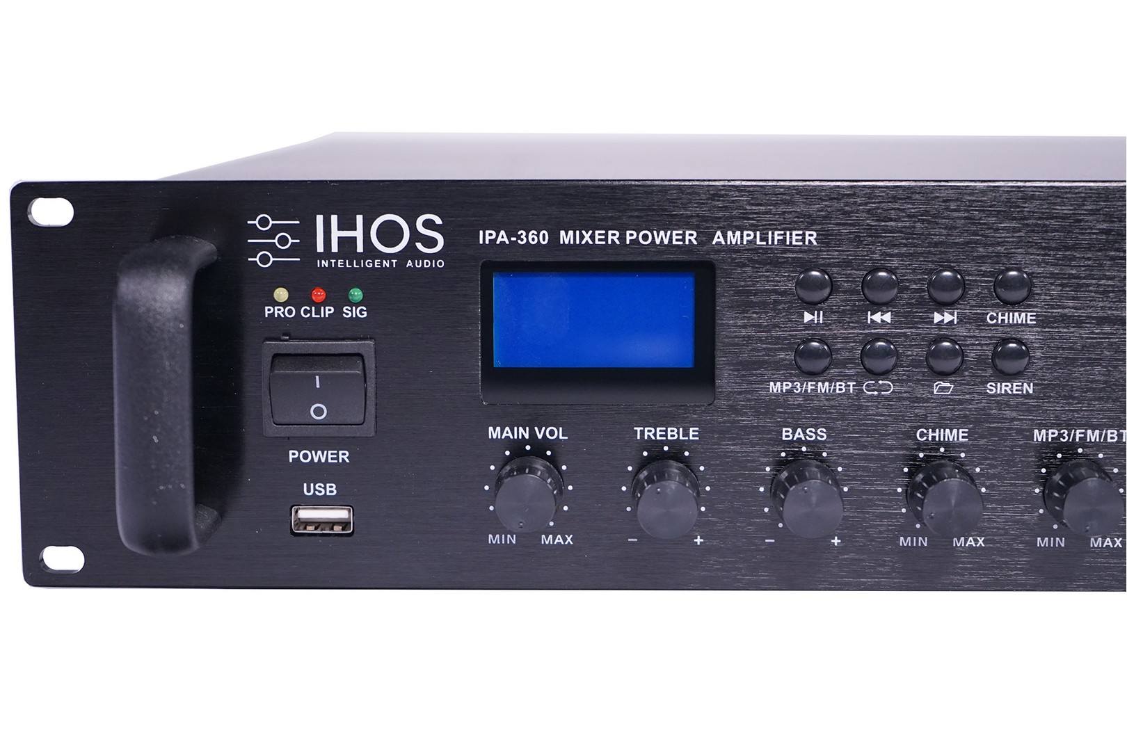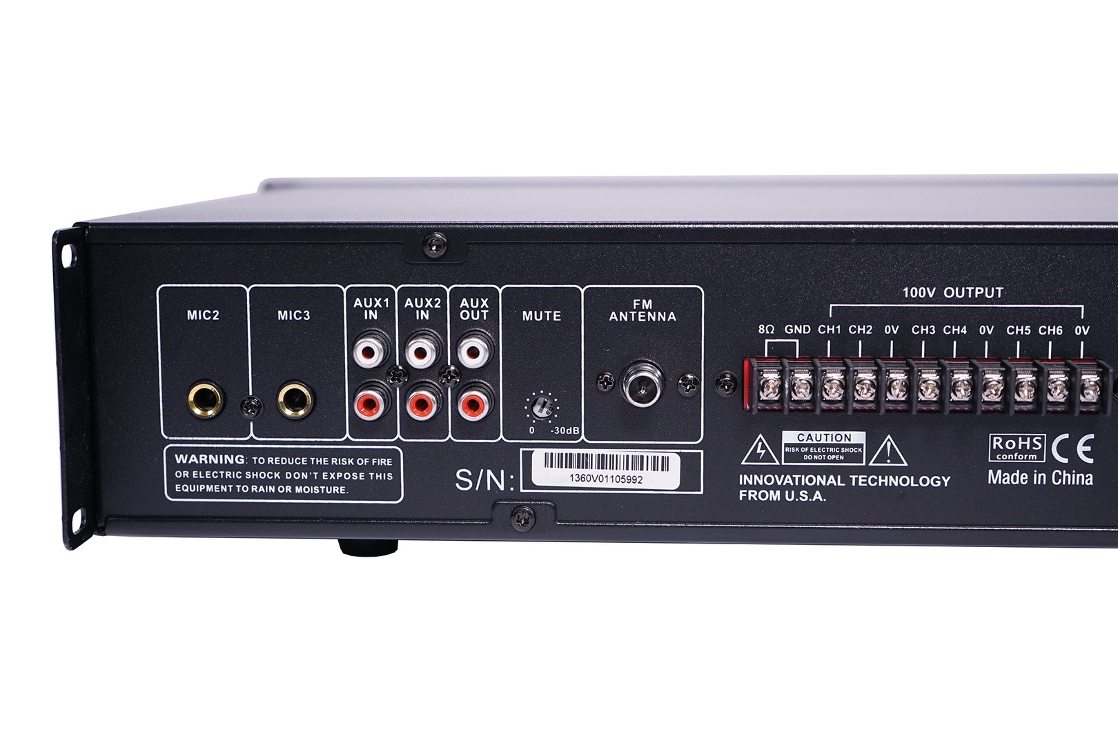 Public Address mixer amplifier 360w, 6 zones speakers with volume control, , 100V / 70V constant voltage output, 8 ohm constant resistance output, mp3, bluetooth, FM tuner ,USB interface,LCD screen, 2 line input, 3 mic input, 1 line output.Treble and Bass,