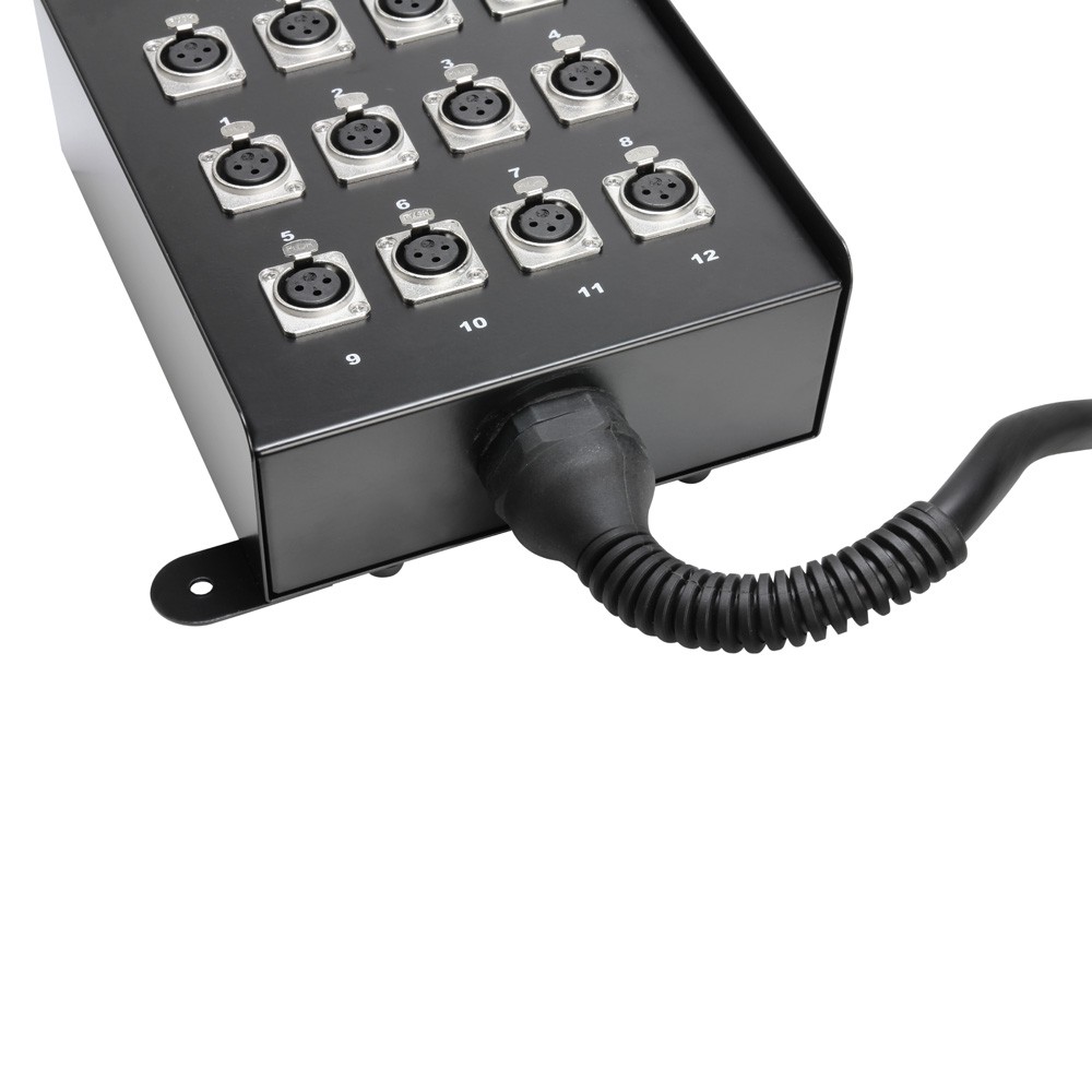 Twelve-channel subcore with permanently attached ten-metre cable terminating in twelve Adam Hall XLR plugs. The all-metal stage box has a solid strain relief in the transitional area between box and cable and an additional mounting lug for permanent installation. The additionally reinforced transition to the terminations prevents fatigue and cable breakage.