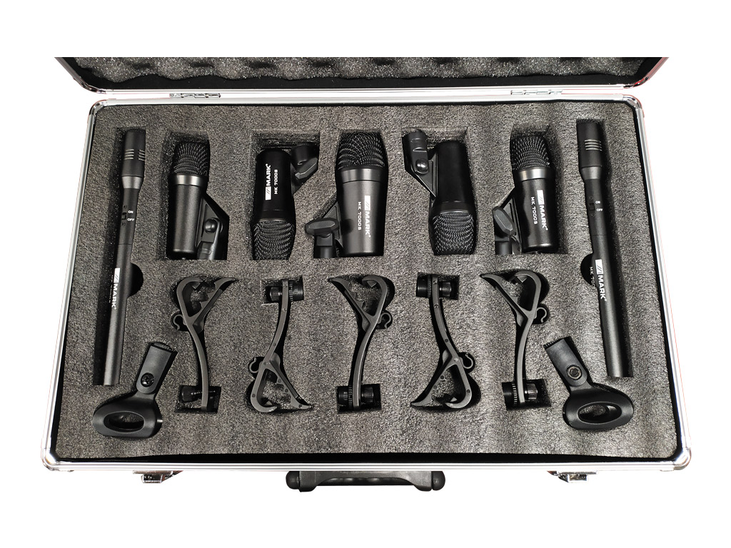 Microphone set for drums.The set includes 7 microphones: 1 kick drum microphone, 4 tom/snare microphones and 2 condenser microphones.