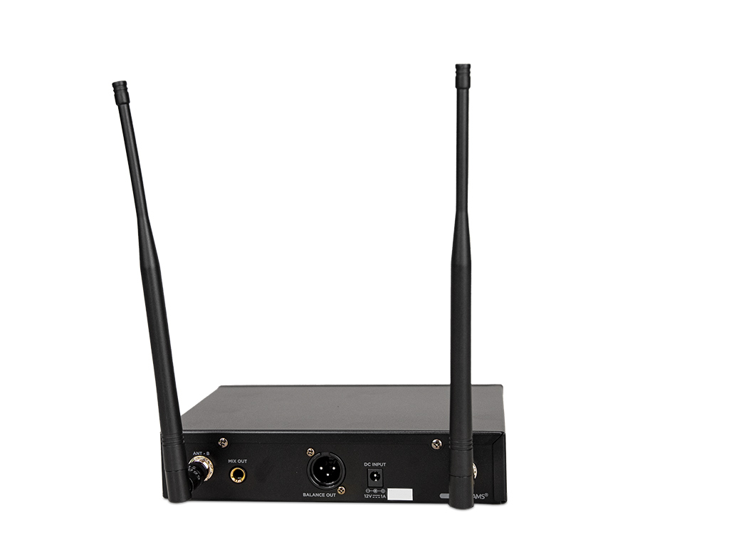 The receiver features balanced output on each channel and unbalanced mix for both. MINIJACK microphone connector male thread.
