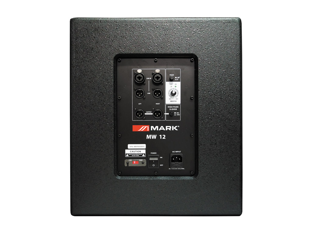 MW 12 with 12” woofer respectively. Incorporates 2-line inputs, 2 LINK outputs and connectivity for two-way active loudspeakers.Its functions include phase inversion switch and high-pass crossover with two different cut frequencies (80 Hz / 125 Hz). The power output can be controlled by a master potentiometer with signal limit LED.Its robust design, elegant finish (made of high-density wood) and shape are very suitable in reinforcement appliances like conference rooms, schools or home cinema installations.MW 12 device incorporates a 35 mm insertion in the upper side.