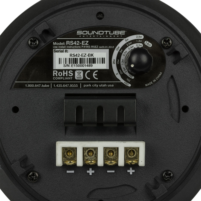The RS42-EZ is a 4-inch, coaxial speaker with BroadBeam Ring™ technology for consistently smooth high frequency sound, designed for open-ceiling applications. Hanging hardware includes galvanized steel cables and a built in hanging bracket with a screw on cover plate for fast, easy and secure installation. Unit may be hung or mounted direct-to-conduit via locking cover plate. The enclosure is constructed of injection molded ABS with glass fiber reinforcement for lasting durability in indoor or outdoor applications. The RS42-EZ speaker utilizes a 4 position ceramic terminal block input connector and a 6 position tap switch with transformer bypass position and has a 16 ohm impedance for easy daisy chaining in low voltage systems. The ceramic input terminal accepts up to 10 gauge plenum rated signal wire and includes thermal fuse. The RS42-EZ is suitable for use in voice alarm applications subject to EU regulations EN60849 and BS5839-8. Hanging hardware, weather plug, cover plate, and AC-RSEZ-HH-10 are included.