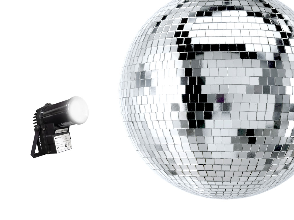 SPOT BALL 120 is a spotlight designed as a complement to a mirror ball in party room or dance floor applications. It can also serve as a lighting effect on a decorative element or specific area in an exhibition hall. It incorporates a 12W Cree Quad RGBW LED and manual control such as automatic or DMX (in the latter mode it uses 7 channels for individualized control of each primary color, general dimmer, strobe effect and macro function). Its interface has buttons to navigate through the different functions, being able to manually select the level of each color and make a desired mix, or run one of the automatic and audio color change programs and control its speed.