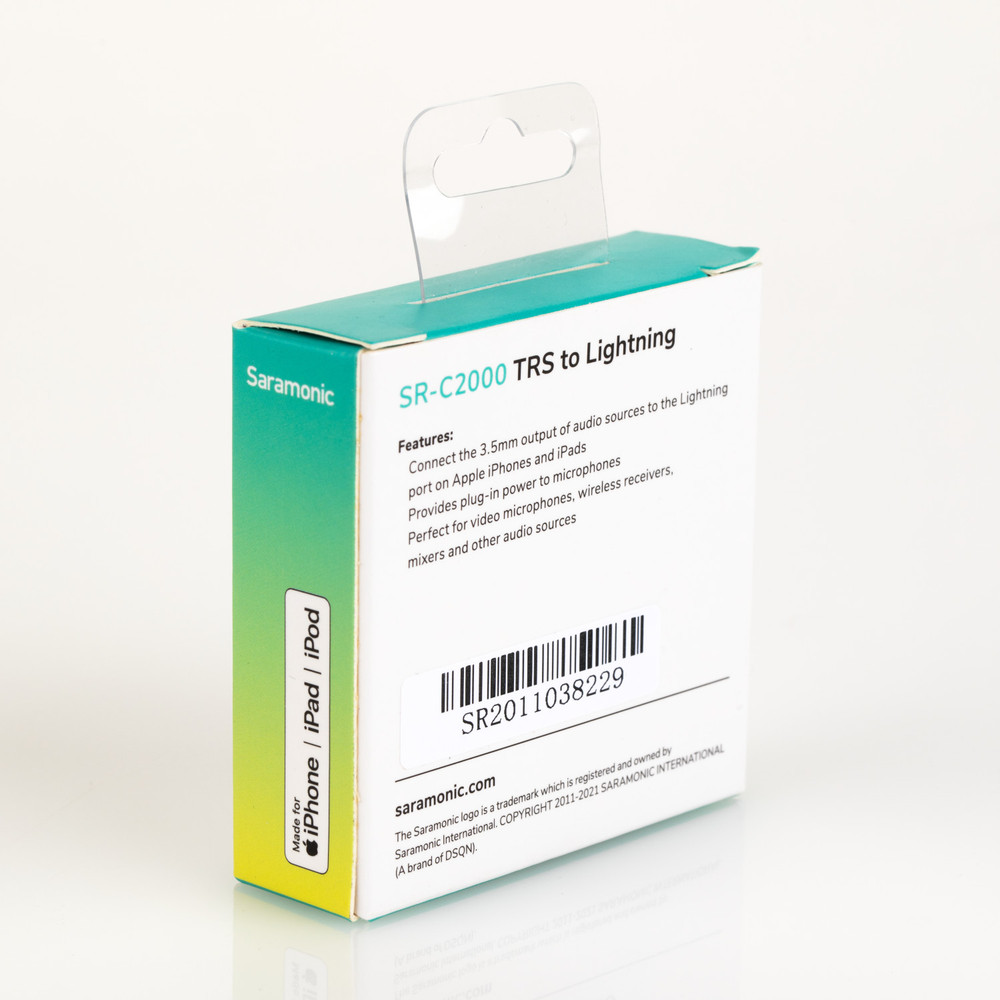 The Saramonic SR-C2000 is a is a powerful audio input adapter for Apple iPhones and iPads with an Apple Lightning connector on one end, and a male 3.5mm TRS plug on the other. Allowing users to record the output of microphones, wireless microphone receivers, audio mixers, and other audio sources into to the Lightning port of an Apple iPhone or iPad.
