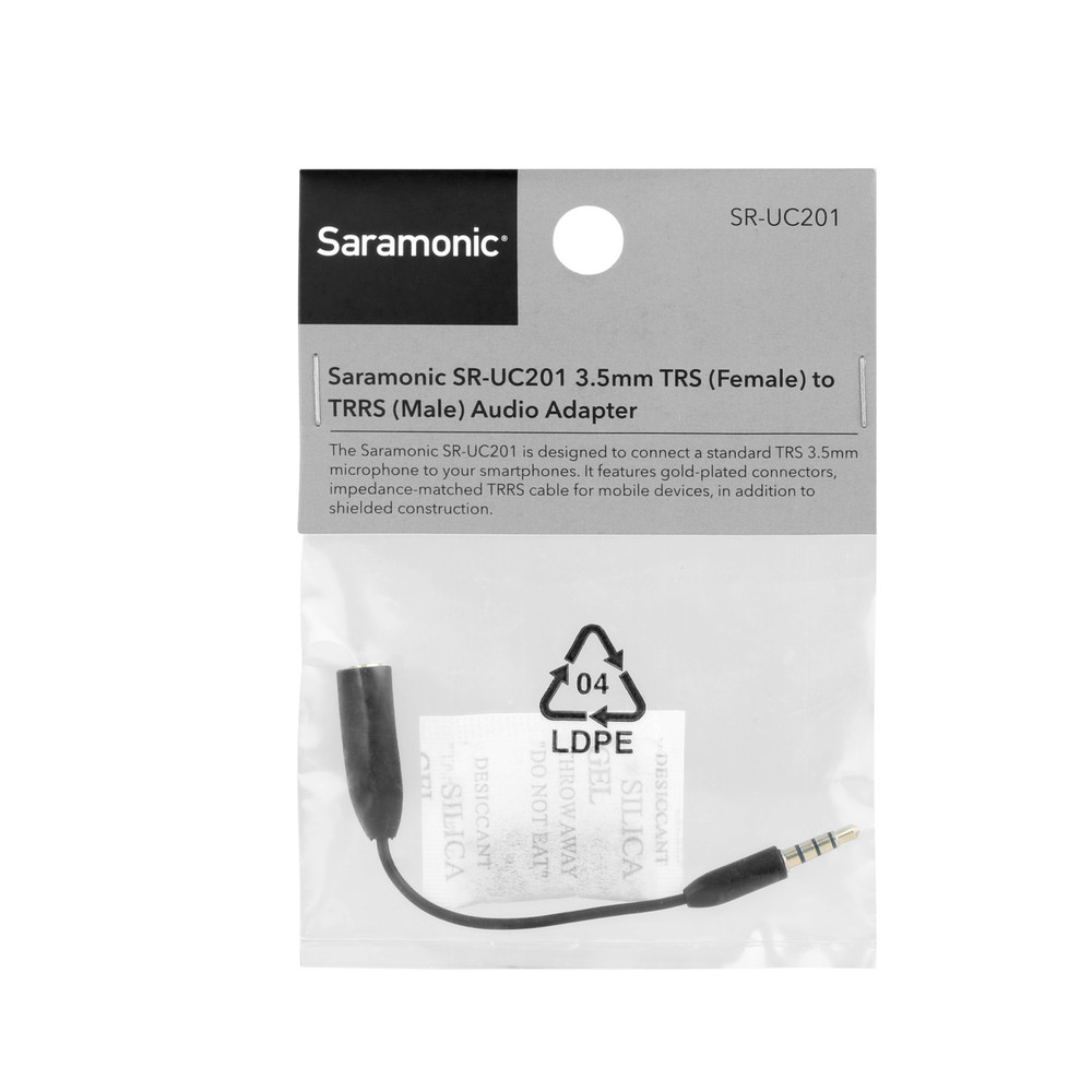 The Saramonic SR-UC201 is a Female 3.5mm TRS to Male 3.5mm TRRS adapter cable that allows you to record audio directly to Smartphones, Tablets and Modern Computers with a 3.5mm headphone connection from almost any device with a 3.5mm audio output.