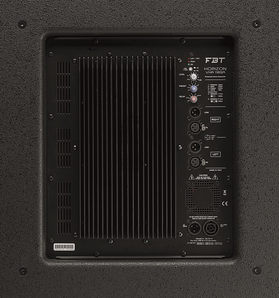 VHA 118.2SA Processed Bass reflex Active Subwoofer – 1×18″ – 2500WrmsThe ground-stacked VHA118.2SA is an exceptionally powerful and versatile subwoofer that sets a new standard for SPL to size ratio. Comprising a single 18″ long excursion B & C woofer, the birch plywood, bass reflex sub, features a 2,500W Class-D amplifier module with 143dB SPL and offers a selection of six entirely rewritten preset algorithms. Processed Active Subwoofer – 2500w RMS – 140dB SPLFor larger spaces, the ground-stacked VHA118SA is an exceptionally powerful and versatile subwoofer that sets a new standard for SPL to size ratio. Comprising a single 18” B&C woofer, the birch plywood, bass reflex sub again deploys a laminar air-flow for refined performance, while its 2,500W Class-D amplifier module offers a selection of six entirely rewritten preset algorithms.The design of the VHA118SA has produced a unique low-end module that is capable of generating extremely high levels of SPL for prolonged periods. Using BEM finite element simulations, FBT has optimised the woofer’s load volume, while careful study of the grille and the assembly’s protective fabric have minimised acoustic impedance for a net improvement in performance compared to previous models. The addition of the VHA118SA extends the overall system frequency response to 30Hz, while the sub can support fully ground-stacked configurations courtesy of special integrated mounting hardware.