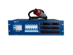 Current distributor equipped with three-phase input connection of 32 A and 6 Type F (schuko) output connectors of 16 A each. On the front panel, a digital voltmeter and ammeter allow the display of the levels of each phase. On the rear panel, apart from the Type F connectors, it incorporates another 32 A output socket for auxiliary power supply. In addition, a protection circuit breaker for each output and a general differential protect the unit against residual currents.