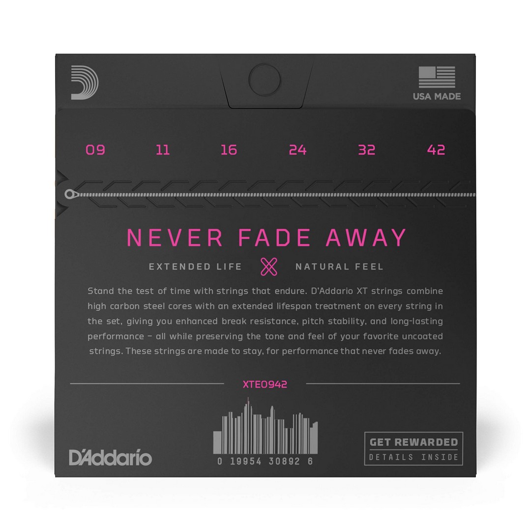 XT Nickel coated electric guitar strings offer enhanced break resistance, better pitch stability, and longer-lasting performance than standard electric strings. The XT coating, applied to each string in the set, delivers advanced corrosion resistance, while still retaining the bright tone and natural feel of the uncoated string. Beneath the coating, XT Nickel are made with a NY Steel core, nickel-plated steel wrap wire, and Fusion Twist technology, resulting in added resilience and tonal versatility, excellent for a wide range of musical styles. 9-42 Super Light gauge strings are easy to bend and very flexible.